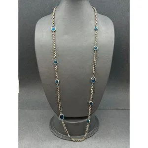 Chico's brand tag, long silvertone chain necklace with translucent teal blue faceted bezeled beads in oval and rectangular/octagon shapes. Some tarnishing on lobster claw closure, and chain has a few kinks which I wasn't able to work out yet, as shown, sold as is.