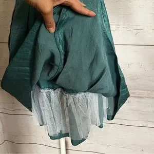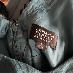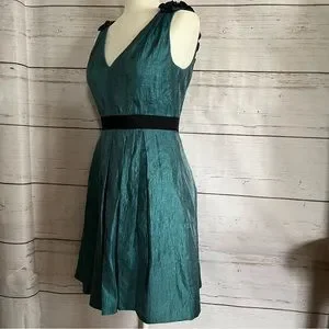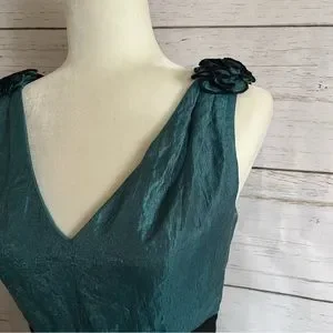 Teal satin crepe cocktail party dress by Adrianna Papell Evening: v-neck midi dress with rose ruffle detail, ribbon waist, zip back closure, fully lined with added crinoline for extra volume, great for a prom, excellent used condition, approximate measurements: 36” long; 18” across armpits; 14” across waist