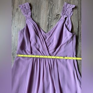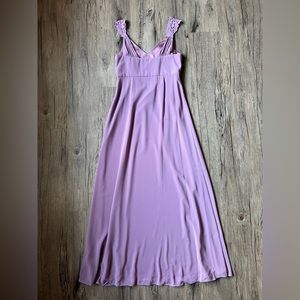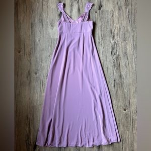 Worn once - good condition, one small flaw on the front near the knee area - photo shown. Ruched bodice that overlaps in the front chest area. Fitted high at the waist and flows out nicely from there. Double lined with beautiful crochet shoulder straps. Zips up the side near the rib cage (hidden zipper).