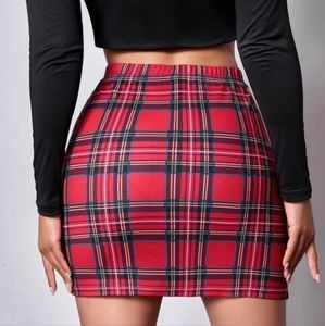 SHEIN Elastic Waist M-slit Hem Plaid Skirt. Never been worn, and sold out online. Cute for a night out, a schoolgirl costume, or a photo shoot. Thin material, high-waisted bodycon style skirt with a tiny slit on the front. Size medium which correlates to a size 6 on their size guide.