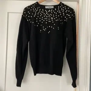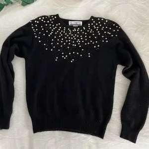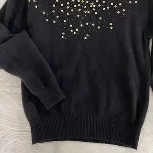 Vintage angora and wool black sweater with gold sequins and small beads. Ribbed waist and cuffs. Excellent vintage condition. Very soft.