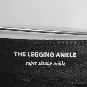 EXCELLENT pre-owned condition: AG Adriano Goldschmied The Legging Ankle Super Skinny Jeans in Black. Button closure, pockets, belt loops. Skinny legs, cropped ankle length, factory distressing.