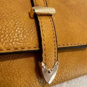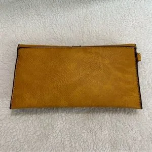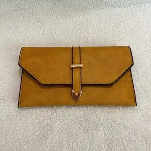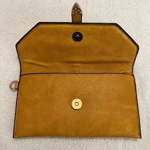 Cute yellow wristlet with detachable strap and gold hardware. Burgundy interior with one zipper pocket. Will fit phone, wallet, keys, and a couple makeup products. Small tear on closure strap from storage, otherwise in great condition with clean interior and exterior.