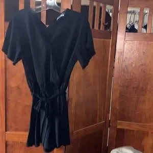 A fun easy to wear romper with a faux wrap front and snap closure for less exposure. Has pockets and a self fabric tie in belt loops.