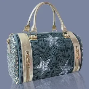 Light Denim and gold, silver embelished duffel tote handbag