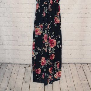 Scobe faux wrap blue/pink dress. V neck and back. Cap sleeve. Ruffled hem down front. Elastic waist. Skirt is line shorts length. Approx. 50.5 inches from shoulder to hem. Size M. Excellent condition!