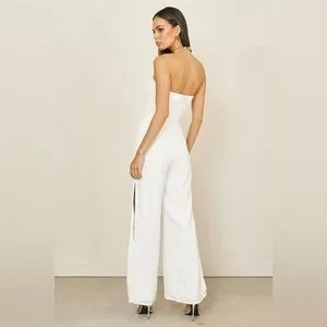 The Nami Jumpsuit from Runaway the label features wide legs and high split on the side. Sleeveless with folded neckline, boning on the bodice, gel tape along the bust area, pockets, a centre back invisible zipper. This garment has lining only on the bodice and no stretch. Body fabric : 100% Polyester, Lining 97% Polyester, 3% Spandex. Please refer to care label for garment care instructions. Colours may appear slightly different to the website due to lighting, computer picture resolution and monitor settings. Perfect for a bride!
