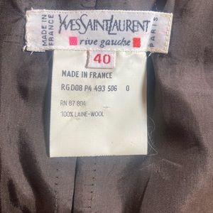 Vintage Yves Saint Laurent robe gauche Paris 100%wool skirt. Excellent condition. (Only flaw is that the label was loose one side-so it was reattached on that side.) Appx measurements laying flat- waist -15”/hips 20.5”/ total length 25”. Side zip and button closure. See photos for details. Close up with zipper shows color best although further away it appears darker. Browns mixed subtlety with a darker blue color. Size 40 -fits is more like a modern medium.