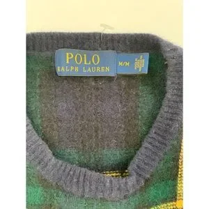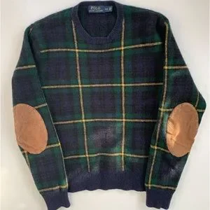 Polo Ralph Lauren Lambs Wool Leather Patch Blue Watch Tartan Sweater Size Medium