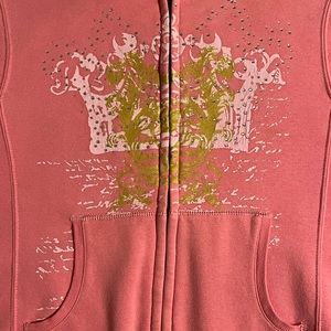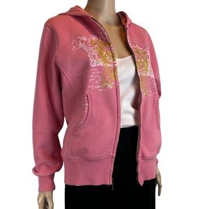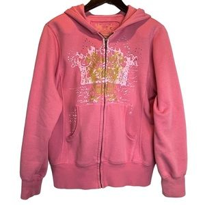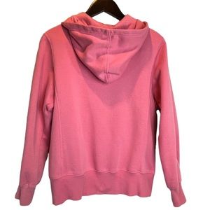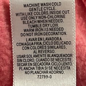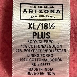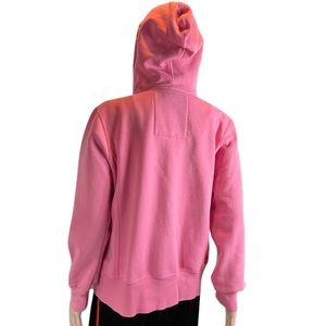 This bubblegum pink hoodie by Arizona is lined in 100% cotton giving you soft comfort. The outer material is a 75/25 blend of cotton and polyester. It has a design on the front catch light just the right way to make you shine. It is in great, hardly worn condition. It also comes from a smoke and pet free home. While flat approximate measurements or taken and listed below: