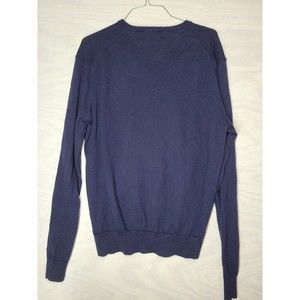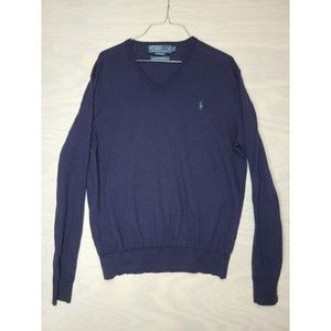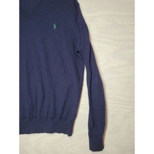 Great Condition, Polo Ralph Lauren Men's SZ L Sweater Merino Wool V Neck Long Sleeve Blue. A Couple Pin Holes in One Sleeve. Checked and did Not See Any More, But There Could Be Since it Is Merino Wool. Shipped USPS Priority Mail.