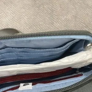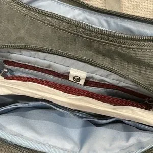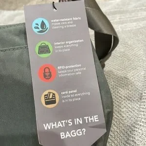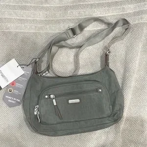 Baggallini. Brand new with tags. Grey with subtle cheetah print background. TONS OF STORAGE- Front pocket with zipper pocket on the very front - inside the packet is divided into two sections - front section has has 6 card slots a longer slot behind for storage and then the pocket section. There is a zippered pouch in the middle that divides the sections. The back section has the pocket area, a smaller zippered pouch, and 2 more cars slots. The main section has a big open space, with two pouches and a zipper pouch on the back. The back of the back has 2 open pouches, great for phone or keys. Can be used as a crossbody bag or can be used on the shoulder as a longer bag or the strap can be shorted to be a shorter over the shoulder bag.