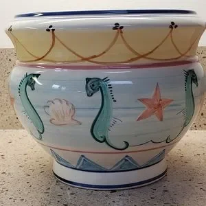 Colorful Ceramic Planter Hand-painted with Seahorses, Starfish & Clams - Approx. 6.25" H x 7.5" W - Top Opening 6.25" - Middle 7.5" - Bottom 4.5" - Colors are Green/Peach/Blue/Mauve/Yellow - In beautiful condition