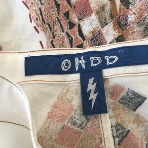 This white maxi skirt from OHDD (made in Italy) is fitted and ends in a flared hemline.  It has a side zipper and an abstract print pattern in the front and back accented with gold colored netting.  It is an Italian size 30 which measures to a small with these approximate measurements: