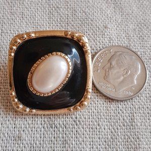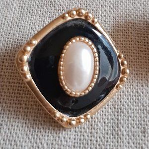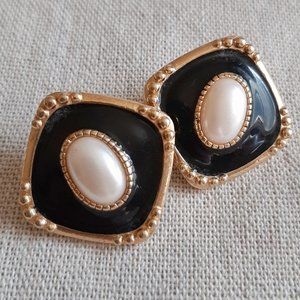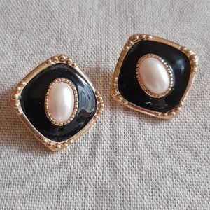 VTG 80's 90's Pearl & Enamel Post Back Earrings. Lovely and ladylike. Oval faux pearl center, black enamel with gold tone setting. Diamond orientation. Could dress up or down. Would look perfect with a vintage Jessica McClintock dress or with a black suit jacket and jeans! Good preowned condition with some light wear.