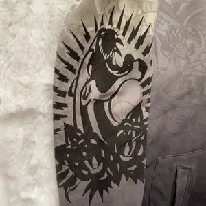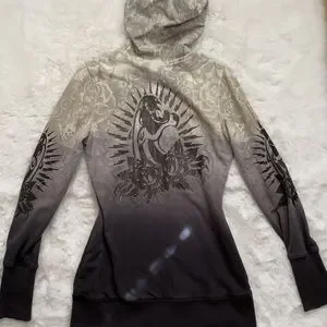 Size Large light and dark grey/black hoodie. Has panther on both sleeves and a bedazzled panther on the front and back. There are different embroidered areas that say Ed Hardy by Christian Audigier. There are different Ed Hardy designs as the pattern. Open to offers!