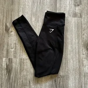 In perfect condition. Just too tight and small for me. Black high rise leggings with a good compression waistband. Deep pockets on either side. Seam detailing down the front of the leg. Full length. The fabric is not as stretchy as some of the other Gymshark leggings, stiffer and thicker fabric.