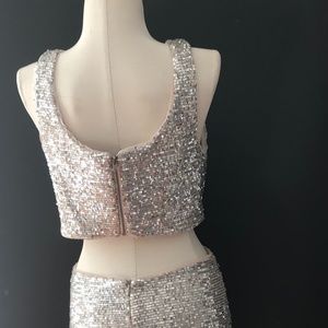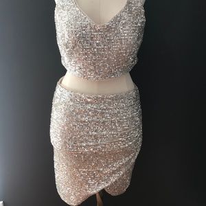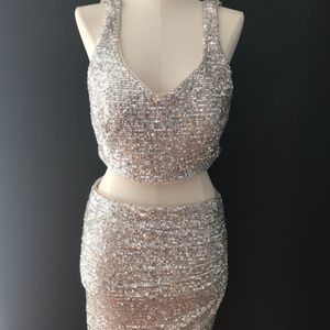 Stunning 2-piece formal dress. Silver sparkle with a light nude underlay. Looks gorgeous in the winter with a fur too! Top is a size 3/4. Bottom is a size 5/6. Used- worn once. Good condition!