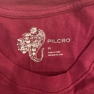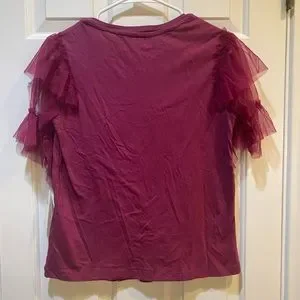 Anthropologie Pilcro tee with mesh sleeves and mesh detail on front sides of top. In raspberry color.