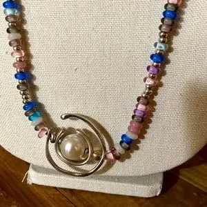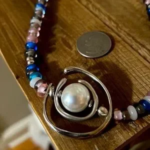 Long silver, bright beaded necklace with faux pearl silver pendant