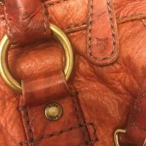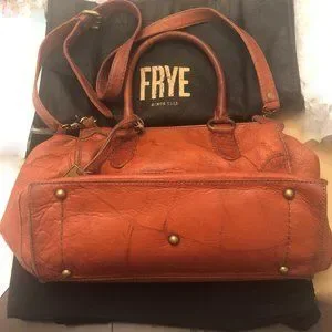 Rare vintage FRYE leather crossbody / shoulder bag with detachable, adjustable strap can also be used as two handle handbag. Very soft leather in a beautiful orange sangria color with subtle marble effects. Top zipper closure, one exterior slip pocket, interior zip pocket, 2 slip pockets and key leash, full lining. Antique brass hardware, bag charm, metal feet to protect the bottom. 13 x 10 x 5 inch. Moderately used, very good vintage condition, clean, no stains or scuffs. Original dust bag is included.