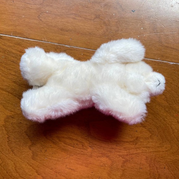 White fluffy polar bear from Aurora toys, this stuffed animal is cute and cuddly. He has hard eyes and nose plus stuffed animal beans inside.
