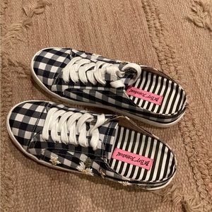 BasICALLY NEW CONDITION I WORE THESE FOR A FEW HOURS WERE TO SMALL FOR MY FEET, SUPER CUTE BETSEY JOHNSON EDNA BLACK AND WHITE CHECKERED EMBOSSED FLOWERS AND BUMBLEBEE SEE PICS GREAT GIFT SLIP ON SNEAKERS SZ. 7.5