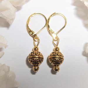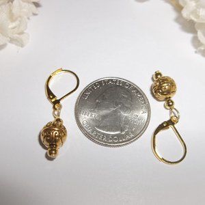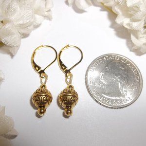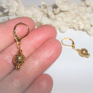 This little beaded earring set is brand new NWT & handmade by me - wvluckygirl. Handcrafted with antiqued gold toned costume jewelry beads. The pair dangle & drop from lever backs euro wire back closures for women's pierced ears. Nickel safe. Measure 1 1/4 inches tall & almost 3/8 inch wide. Each single earring weighs 1.9 grams. Lightweight. Very versatile set. Perfect for any occasion. Could be worn fancy dressing up or dress down business casual. Grab them as a sweet treat for yourself or as a thoughtful gift idea for someone else. Buy them now before someone else does!