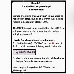 Bundle with other items in our closet to save on shipping. Bundles of 2 or more items may be eligible for a price and shipping discount. If you need help with how to bundle, please ask. We are here to help.