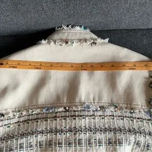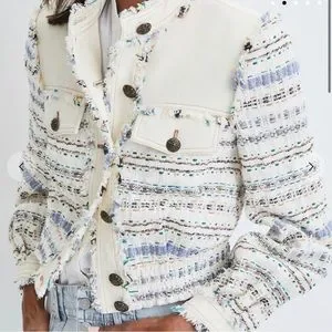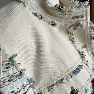 Perfect for Spring! The dressy jean jacket. Darren jacket, fully lined but lightweight, features decorative buttons for elevated look with jeans and heels, elastic waist trim, fringe detailing in blue, green, tan and black details against a ecru smooth finish denim.