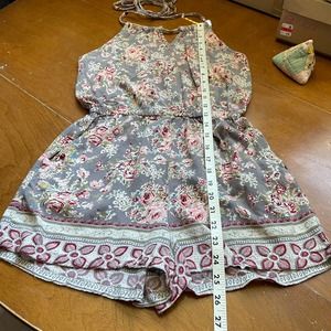 Grey, gray and floral shorts romper with halter top style and shirred back for extra stretch. This romper is very light weight, has pockets and is perfect for summer!