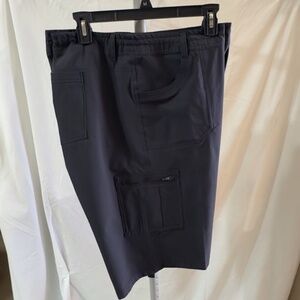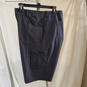 This is a great pair of KUHL outdoor hiking shorts. They are the Horizon style, made from strong, lightweight ripstop (machine washable polyester) fabric that is quick drying. Women's size 20W. Color is solid black. Lots of great features: internal drawstring to adjust waist fit, two front and two pack pockets and two side thigh pockets with zipper closure.