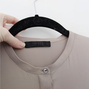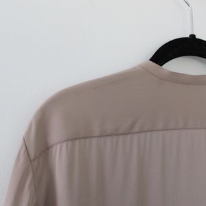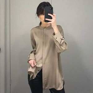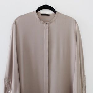 The Row taupe/beige, solid, long sleeve, jewel neck, button front, ‘Cola’ oversized silk shirt. Quality-made, silk satin fabric construction. Concealed button front closure with eight shell buttons. Banded collar jewel neckline. Oversized, relaxed, longline silhouette. Long button cuff sleeves. Contrast eggplant-colored stitching detailing at cuffs & back. Shirttail hem. Made in USA. Excellent condition - faint mark at back shoulder (pictured).