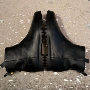 Gorgeous and high-end Stuart Weitzman genuine black lambskin leather Riley moto biker lug ankle boots! So chic, classic and versatile. Interior side zip with leather pulls, gold hardware detail and chunky rubber lug soles. Gently worn and in overall lovely condition — they have a few minor inevitable scuffs on leather but nothing noticeable. (Could always be polished) Some little pebbles/dirt stuck in the higher traction on bottom soles. (Should clean up fine if bothersome but all traction in tact/not worn down) Very comfortable. Harder to find style in this smooth leather! Retail over $600+ with tax.
