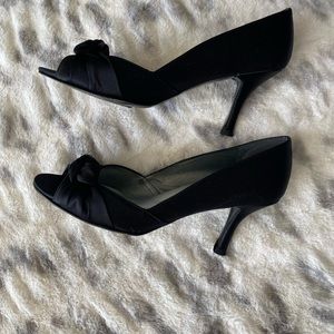 Stuart Weitzman Turku Black Satin Peep Toe Pump