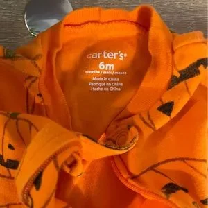 Footed PJs with pumpkin/jack-o-lantern design. Features two way zipper. Good condition, no flaws.