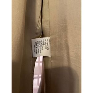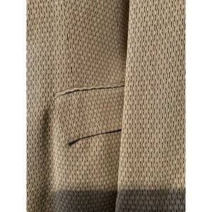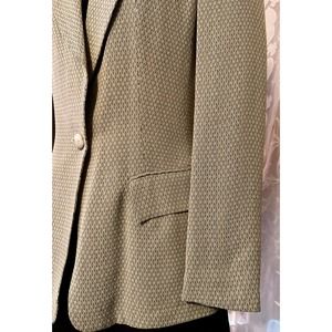 This is a beautiful soft form fitting one button jacket with 3 buttons on each sleeve, faux pockets and split lapel fully lined, lightly padded shoulder for that trim sleek finish. I am not sure what the fabric is but it feels like some of my other fine silk or crepe jackets.