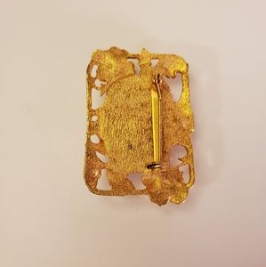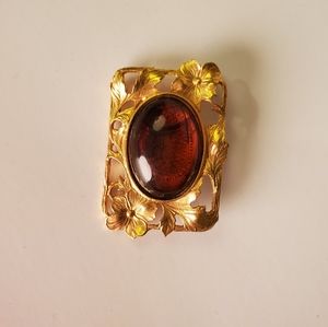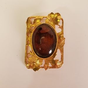 Gold color decorative pin has floral jungenstil type edge and amber-looking oval stone in front. I do not know what the materials are for either the stone or the metal.