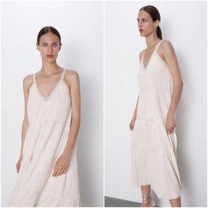 ZARA BANDAGE Knit Pleated Midi Dress Ivory Stretch Sleeveless V Neck Viscose L