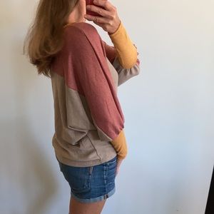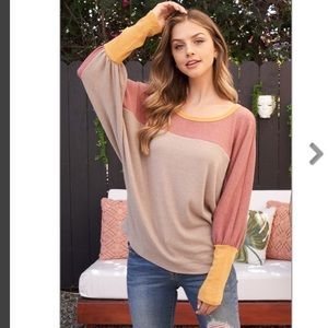 Color Block Dolman Sleeve Top. Super cute Fall wardrobe staple. Taupe, mauve and mustard colors. Long dolman style sleeves. Ribbed texture. 78 polyester 18 rayon 4 spandex. Fit is true to size. I am modeling size Small. New boutique item.
