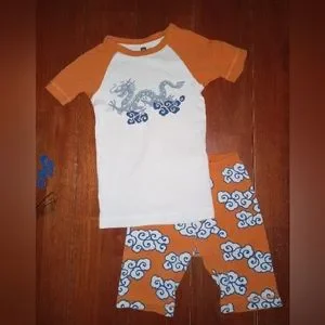 2 sets of size 6 Tea pajamas. both in fair to good used condition with ton of life and play left. The dragon set is not as white as brand new . And the shark set has a few loose stitches at the bottom hem as you can see in last pic . No holes,stains or rips.