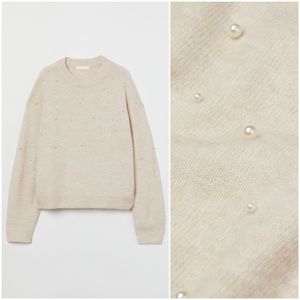 Soft, knit sweater with wool content with sewn plastic beads at front. Crew neck, dropped shoulders, and long sleeves. Ribbing at neck, cuffs, and hem.