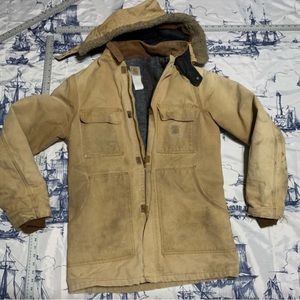 This jacket has been used on a ranch. It is distressed. Still in very usable condition. These jackets last forever. Comes with detachable hood.