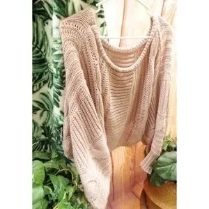 Warm chunky mixed stitch knitting, trendy off shoulder fit, beautiful neutral blush mauve color and has the perfect slouchy fit. No size tag. Fits a size L/XL best. Model is a size medium and 5β6 for reference. In excellent condition!