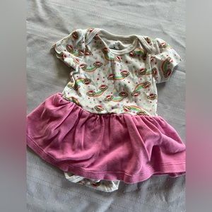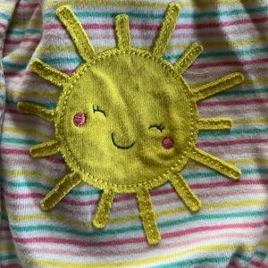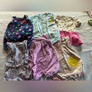 Adorable bundle of 6 summertime rompers or one pieces for baby girl! All Carter’s brand in 6 months or 3-6 months (same size), except for the sock monkey/rainbow themed one which is Baby Starters brand.