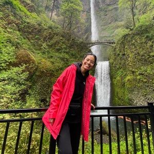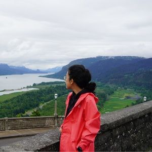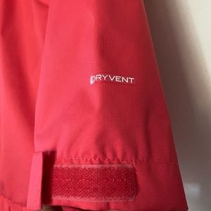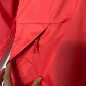 This coral/pink jacket comes as a 2-in-1 piece! The dark gray fleece lining can be zipped down and worn on its own. This xl youth jacket fits xs-small adult. The jacket is waterproof and kept me dry on my hike through the Oregon waterfalls.