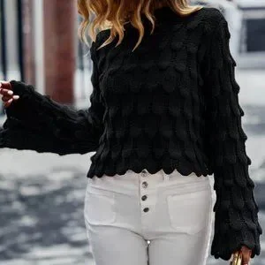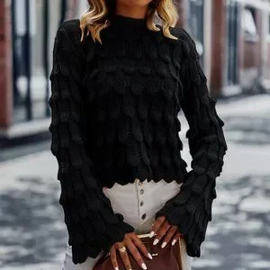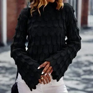 Mock Neck Trumpet Sleeve Textured Knit Sweater grayish black