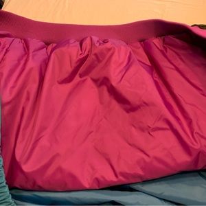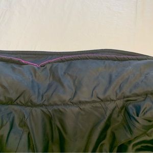 Outer shell jacket is teal and the reversible liner is black and purple. A few small scuffs and the top snap is broken on the shell jacket as visible in the photos.