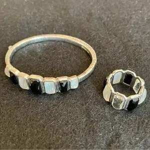 Gorgeous, like new IPPOLITA hammered, sterling silver bracelet and ring set. Oval bracket with push button clasp fits wrists size 6.5-7.5”. Ring is size 7. Both feature faceted black onyx, mother of pearl, and crystal.