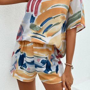 Multicolor Preppy Womens Brush Print One Shoulder Batwing Sleeve Top & Shorts